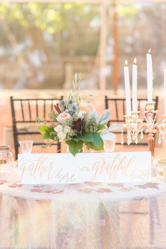 Jontell and I had the vision to create a very fall themed styled shoot that would include a sweethearts table as well as a desserts table all centered around the warmth and colors that come to life during the fall season. We incorporated details such as small pumpkins, red and maroon leaves, gold accents, fall themed desserts such as cranberry scones and mini apple pies, and signs expressing the gratitude that is emphasized during this time of year. Visually the styled shoot focused on warmer tones such as maroon, blush in the dress and shoes and gold hues in our decor. We loved that the styled shoot itself brought forth the element of a fall season of connectedness, gratitude and thankfulness with many vendors gathering around a table, putting in their time and effort to bring a collective vision to life.