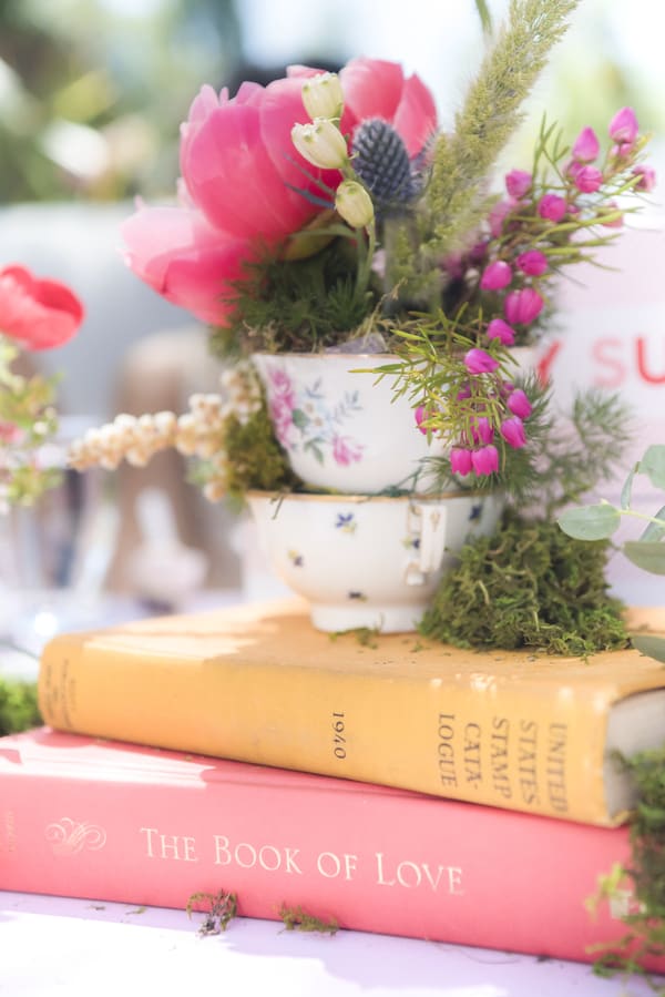 The amazing wedding planner, Christina of Emeline, created these gorgeous tea cup floral centerpieces (with the help of Mack Floral Design), with books and antique knickknacks. They also created a giant keyhole through which the guests and bridal party would enter through to transport them to the magical world that they had created. The venue was a great backdrop, and the couple chose it because it reminded them of Alice in Wonderland the moment they laid eyes on it.
