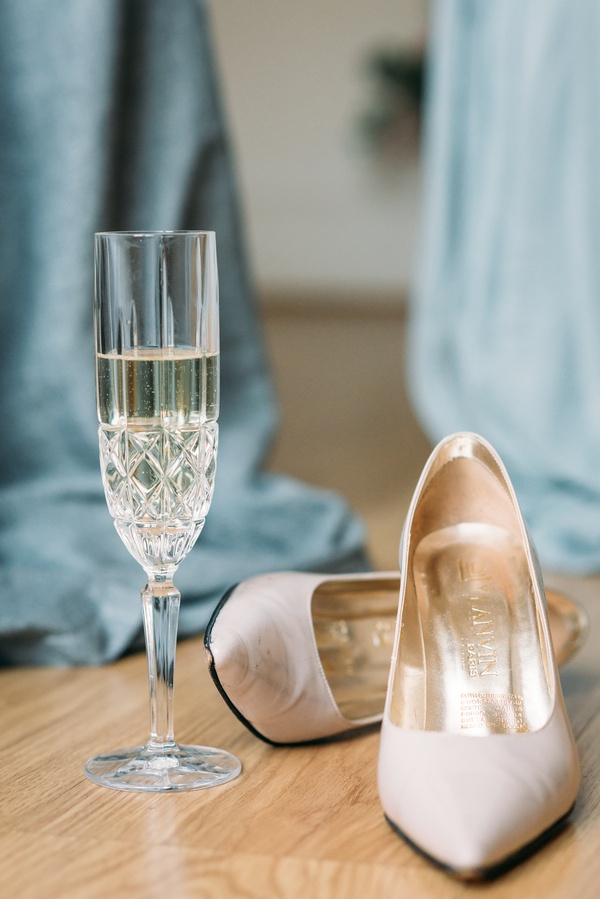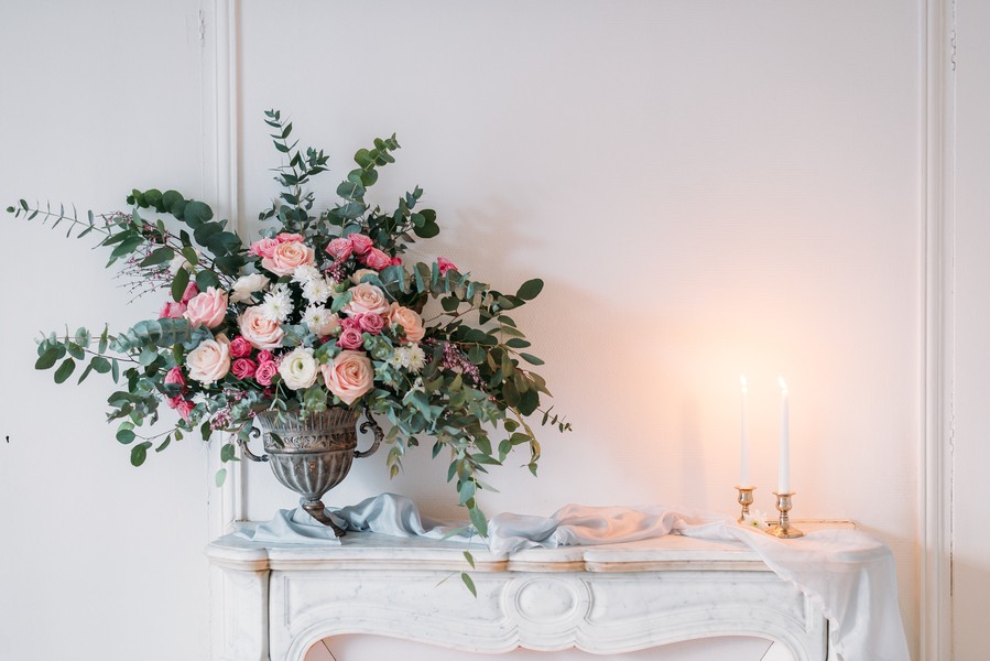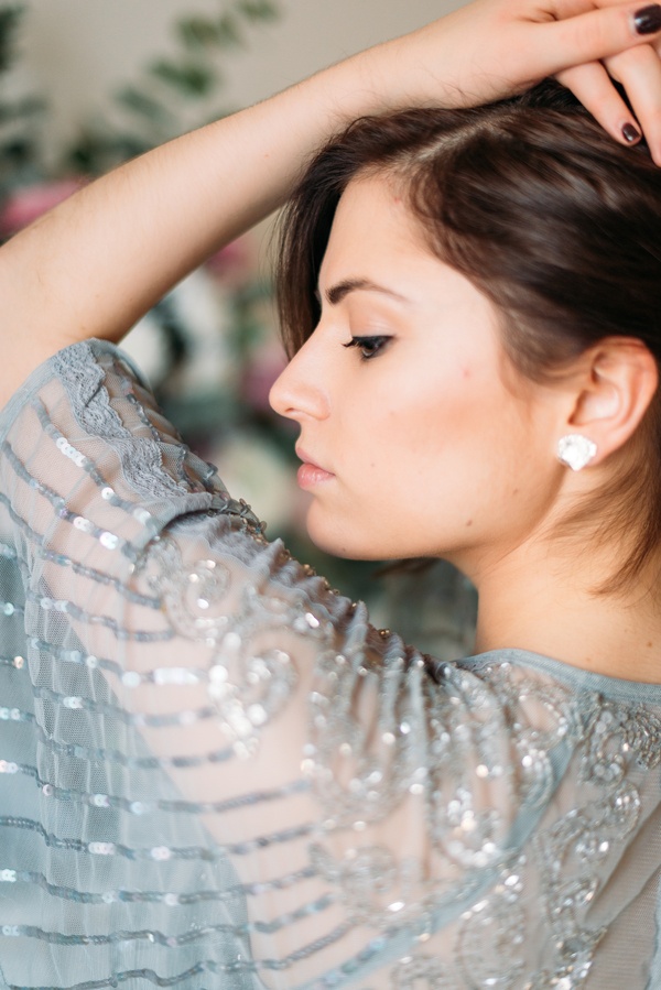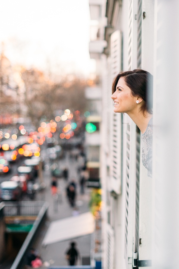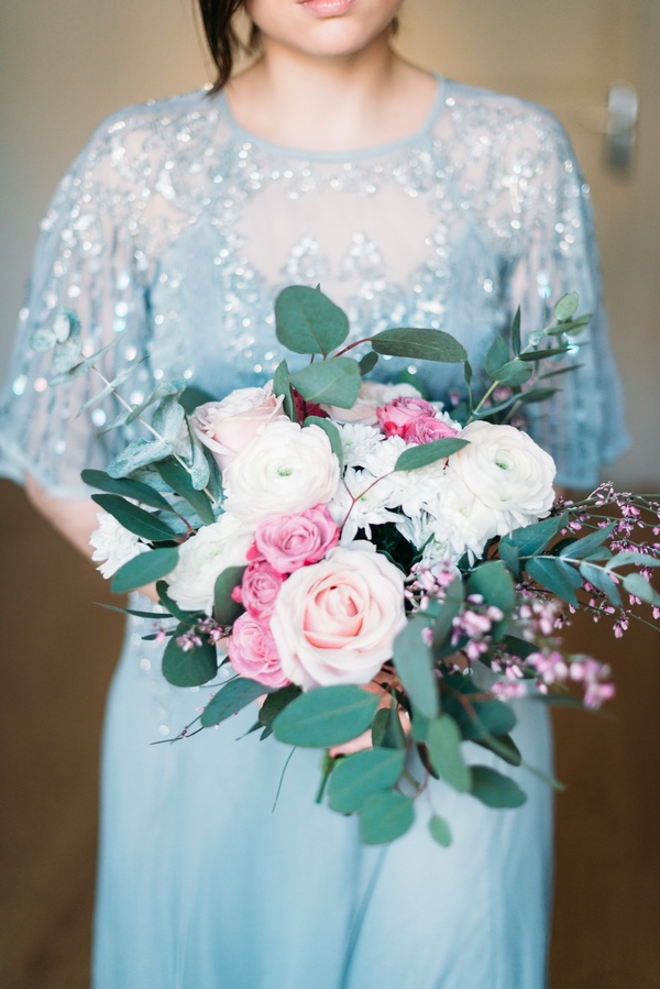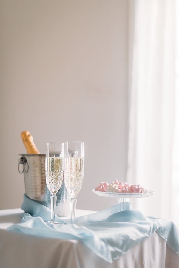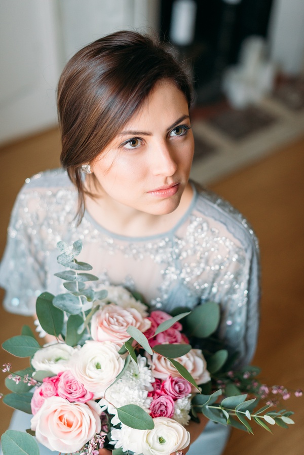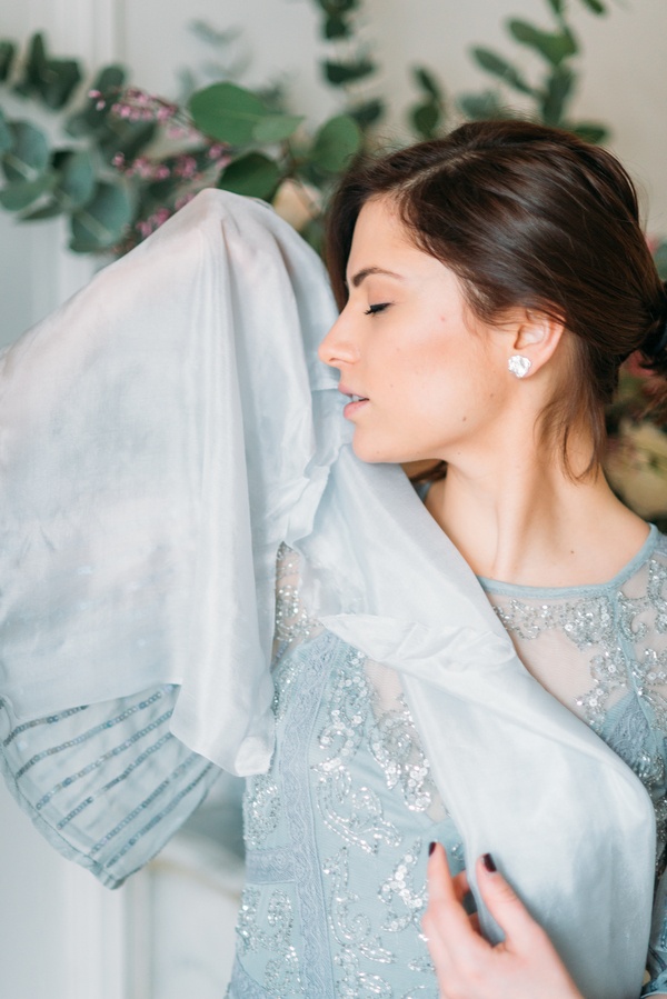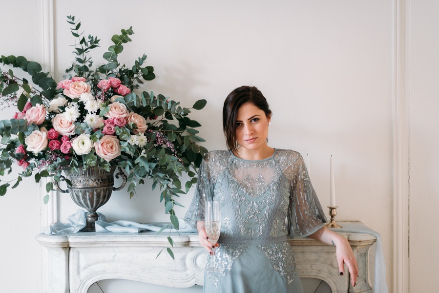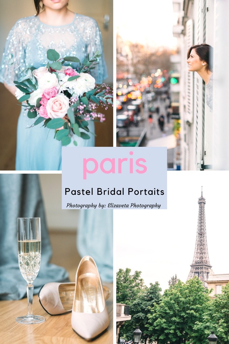 Pastel Bridal Portrait Inspiration from ParisThis inspiration shoot was actually inspired by simplicity – instead of trying to coordinate a big production with many vendors, I decided to grab a (very photogenic) friend, borrow a beautiful dress and use my tiny old-world Parisian apartment as a backdrop (after I cleared out every bit of furniture from the room).  I put my wedding gifts to good use, with Waterford crystal glasses and Moet champagne to give this shoot a celebratory touch. The morning of the photo shoot I went to a flower stall down the street at Place des Ternes and bought roses and eucalyptus for my mantlepiece and bouquet. The finishing touch was my custom-made engagement ring made by my good friend Eduardo, in his Paris studio.