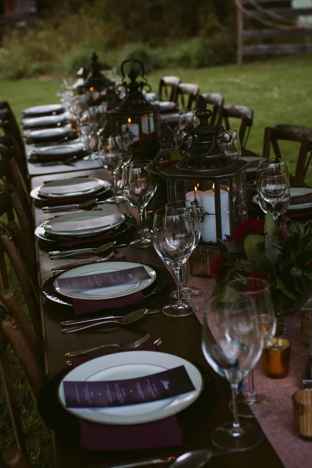 We wanted to create a romantic and intimate atmosphere for the reception tent so it was lit with Edison lights, candles and lanterns. Agate pieces were purchased at Bedrock Supply and hand calligraphied by Jars of Clay Calligraphy. Florals were created by Bryanna Kumpula Designs and featured local flowers such as chocolate lace, bleeding hearts, roses, amaranthus, and chocolate basil giving the atmosphere an earthly, welcoming scent.