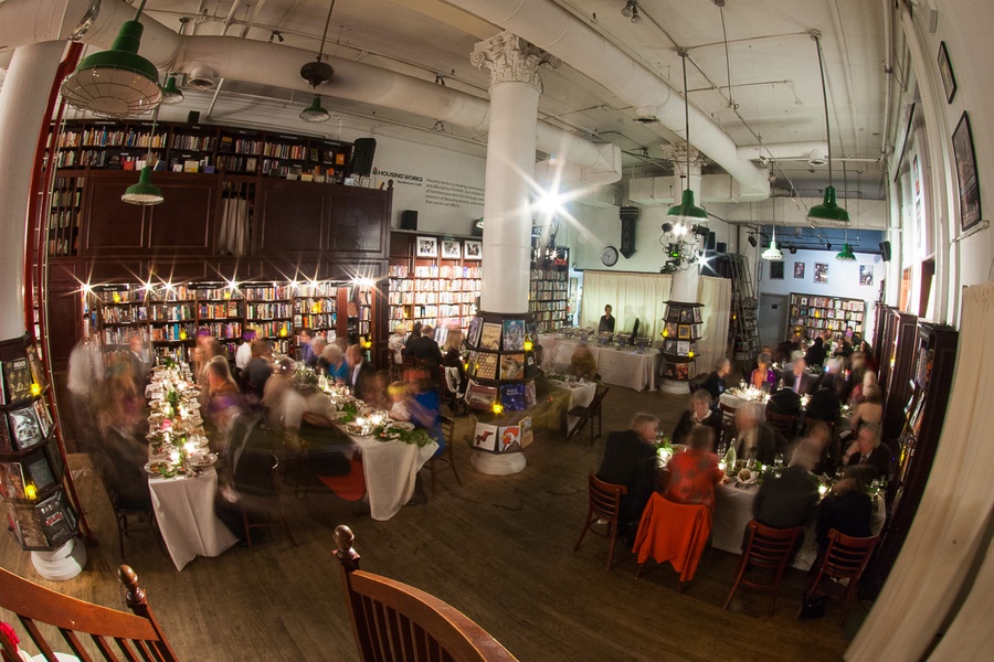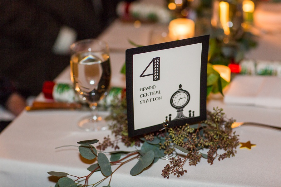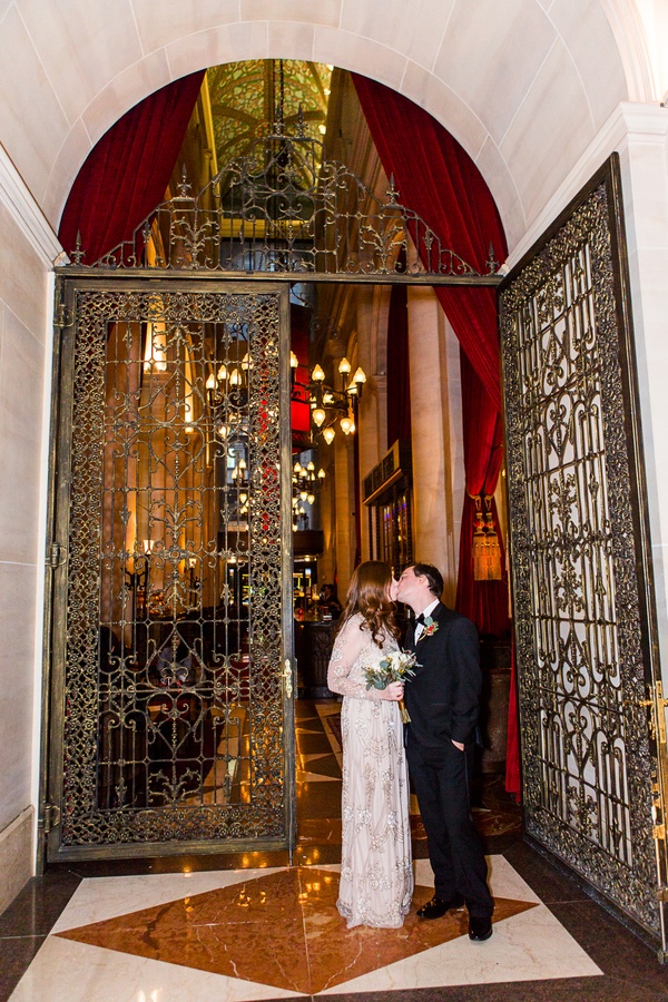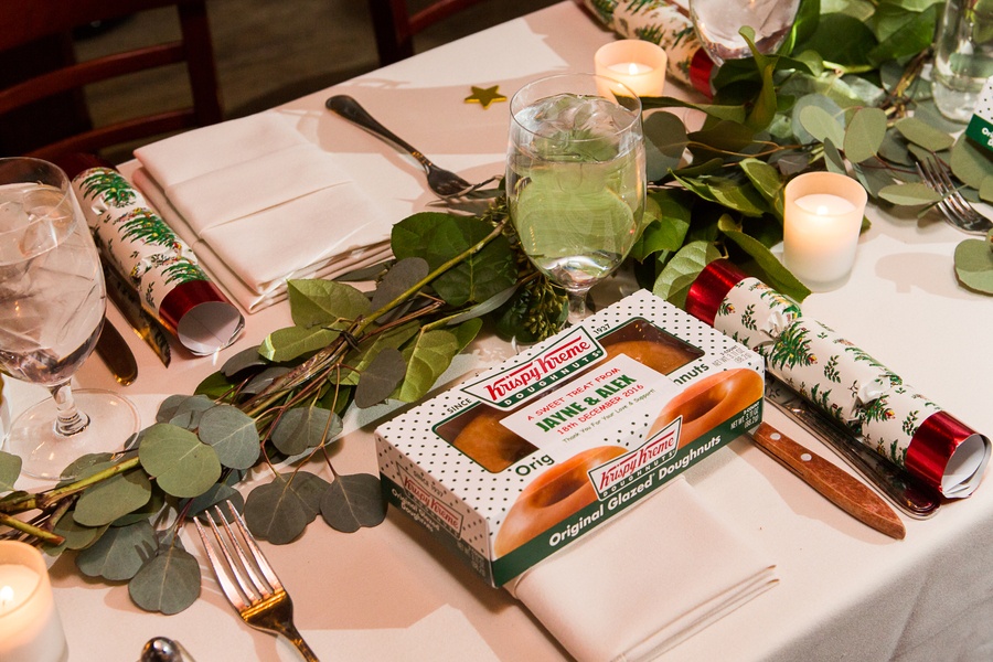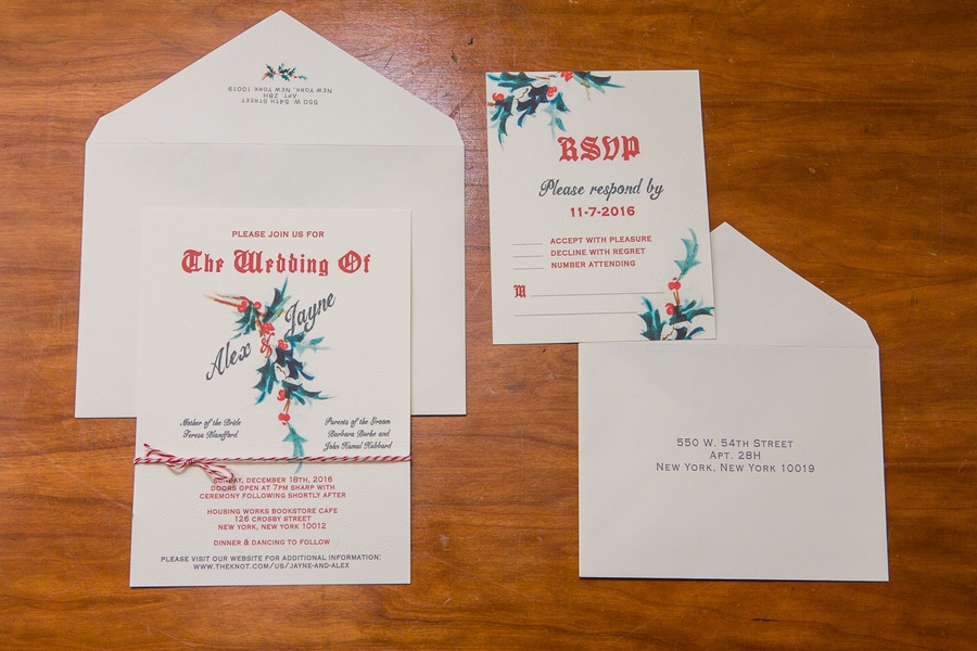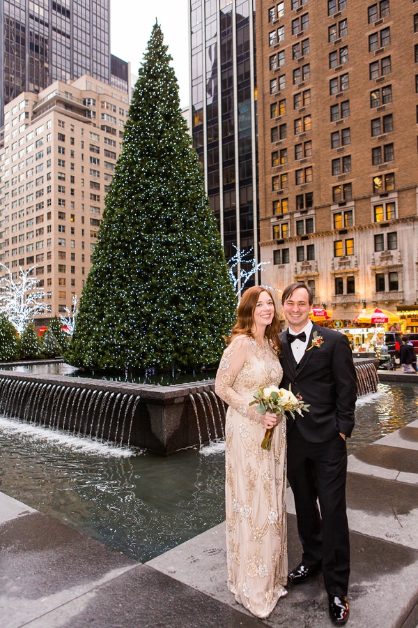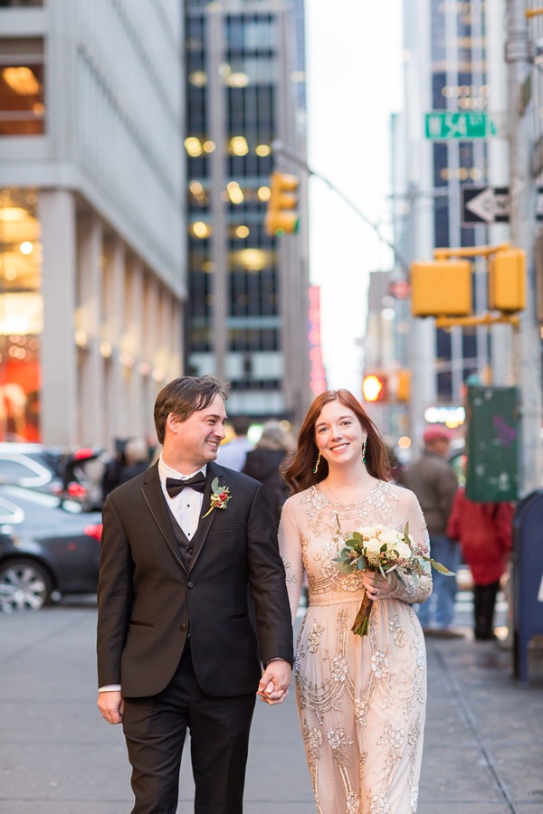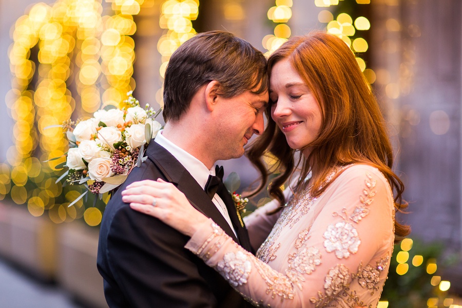 Jayne & Alex were married on a Sunday evening in December at Housing Works Bookstore in Soho. Since the sun sets around 4:30 in the winter here and we wouldn’t be at the bookstore until after dark we planned to do their first look and portraits up near their hotel in midtown a bit earlier while it was still a bit light out. Though the forecast called for rain most of the week we kept our fingers crossed and got lucky when Sunday rolled around– no rain during the time we had scheduled for our walk outside! Jayne and Alex used to meet up by the LOVE sculpture by Robert Indiana, on the corner of 6th Avenue and 55th Street in Manhattan, which was just a block and a half from the hotel, so naturally, it was the ideal spot for their first look. Jayne looked incredible in her elegant long sleeve gown with gold and cream beadwork and we had no shortage of beautiful backdrops within the surrounding blocks– there were christmas lights and trees all over the place! After heading back to the hotel to meet up with their wedding party we were escorted to the top floor of Le Parker Meridian, where they had generously allowed us to make some group portraits. With that taken care of we all made our way down to SoHo for the main event. The bookstore was picture perfect and cozy as can be. After a beautifully performed ceremony with vows written by the couple themselves, guests were treated to a delicious feast at long tables filling the back of the bookstore. Highlights of the evening included a series of heartwarming toasts to this wonderful couple, a sweet first dance number, a beautiful wedding cake, and a delicious favor for every guest: Krispy Kreme Donuts boxed for the occasion! Congratulations to Jayne & Alex!