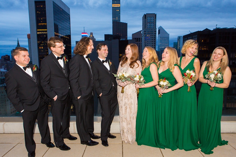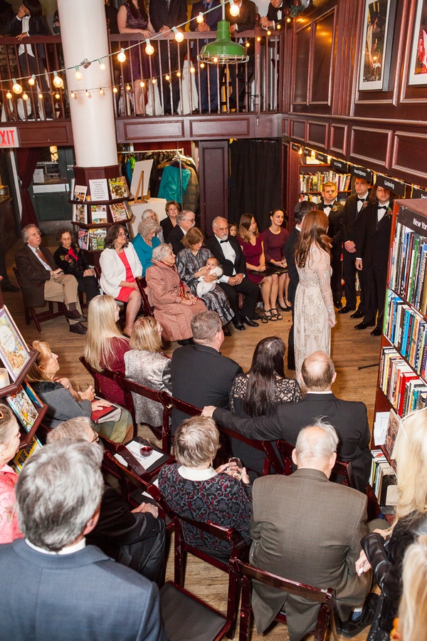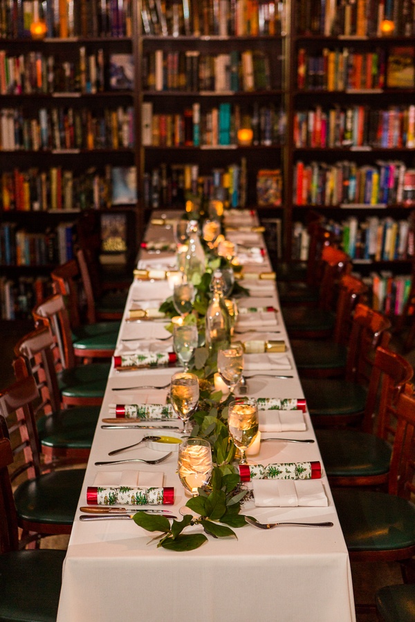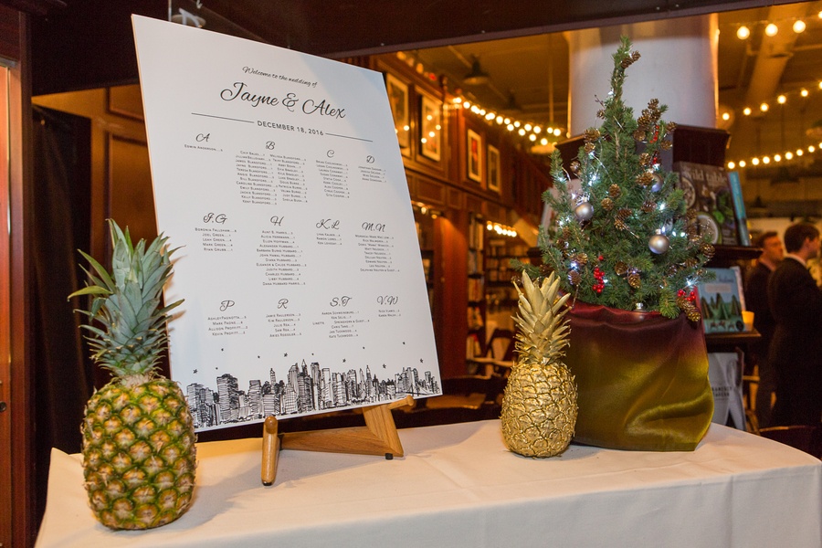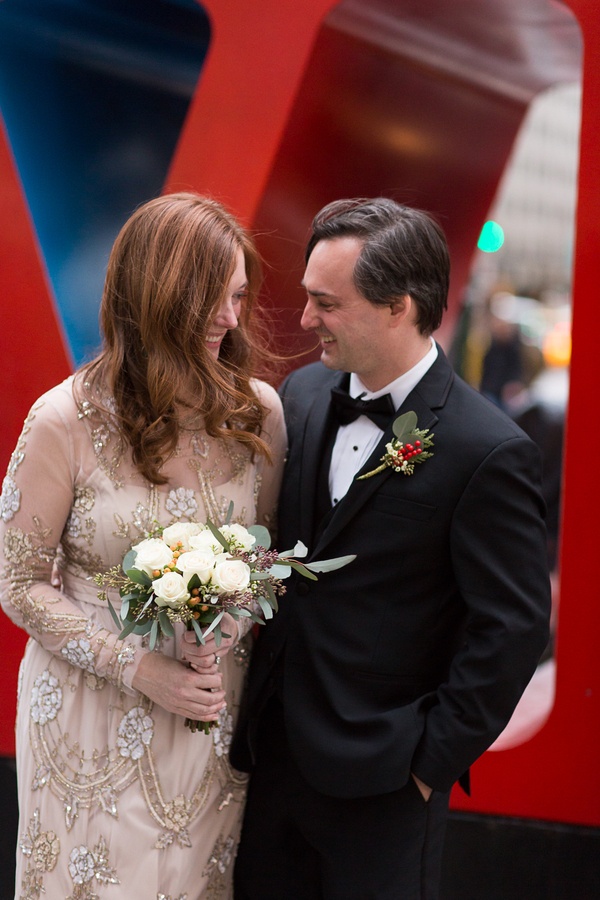 Jayne & Alex were married on a Sunday evening in December at Housing Works Bookstore in Soho. Since the sun sets around 4:30 in the winter here and we wouldn’t be at the bookstore until after dark we planned to do their first look and portraits up near their hotel in midtown a bit earlier while it was still a bit light out. Though the forecast called for rain most of the week we kept our fingers crossed and got lucky when Sunday rolled around– no rain during the time we had scheduled for our walk outside! Jayne and Alex used to meet up by the LOVE sculpture by Robert Indiana, on the corner of 6th Avenue and 55th Street in Manhattan, which was just a block and a half from the hotel, so naturally, it was the ideal spot for their first look. Jayne looked incredible in her elegant long sleeve gown with gold and cream beadwork and we had no shortage of beautiful backdrops within the surrounding blocks– there were christmas lights and trees all over the place! After heading back to the hotel to meet up with their wedding party we were escorted to the top floor of Le Parker Meridian, where they had generously allowed us to make some group portraits. With that taken care of we all made our way down to SoHo for the main event. The bookstore was picture perfect and cozy as can be. After a beautifully performed ceremony with vows written by the couple themselves, guests were treated to a delicious feast at long tables filling the back of the bookstore. Highlights of the evening included a series of heartwarming toasts to this wonderful couple, a sweet first dance number, a beautiful wedding cake, and a delicious favor for every guest: Krispy Kreme Donuts boxed for the occasion! Congratulations to Jayne & Alex!