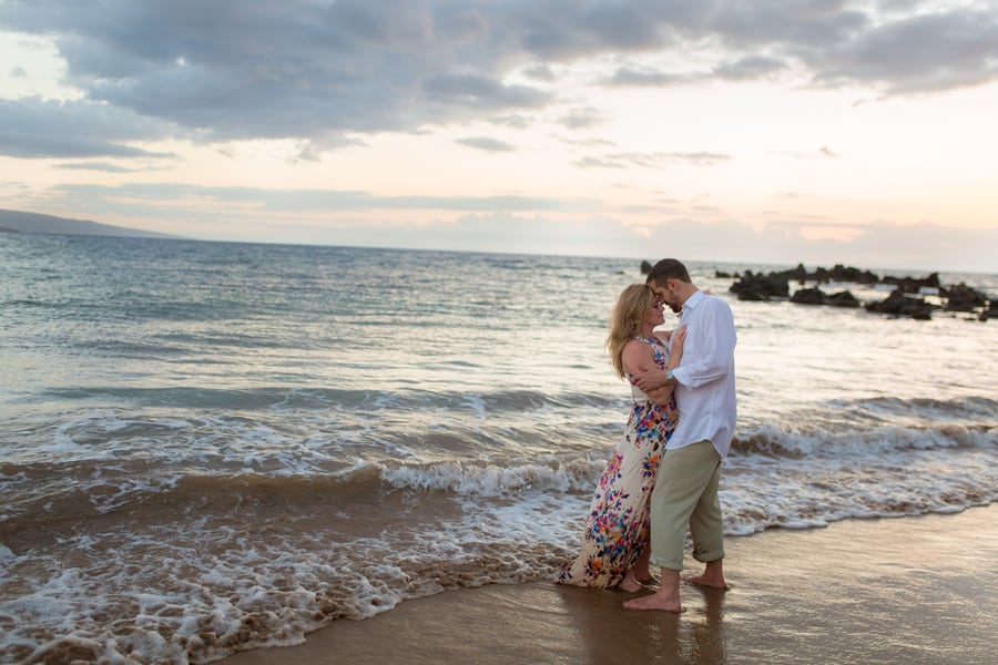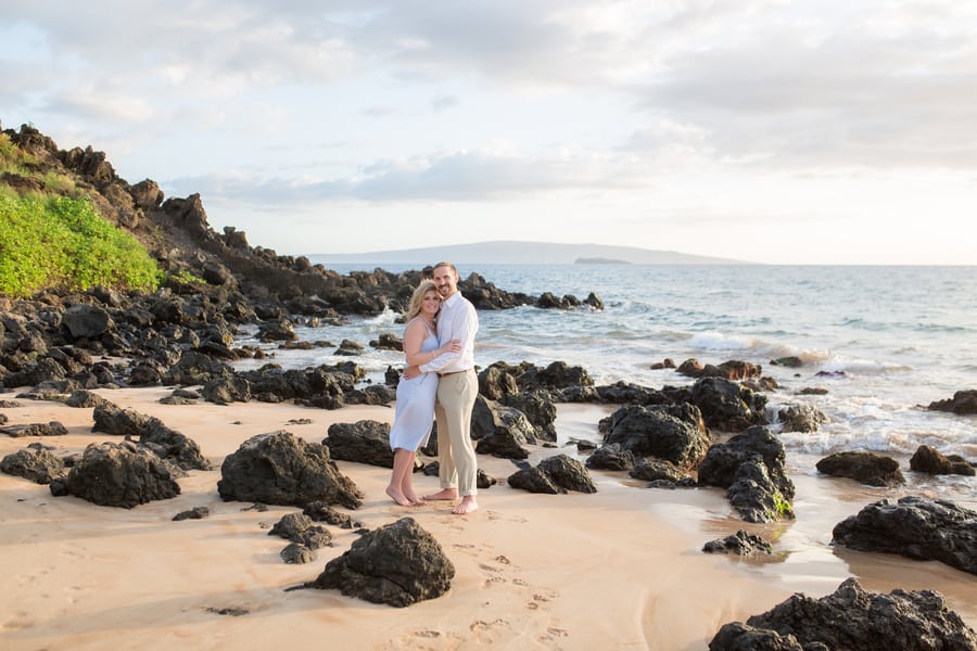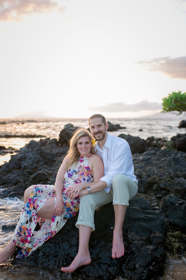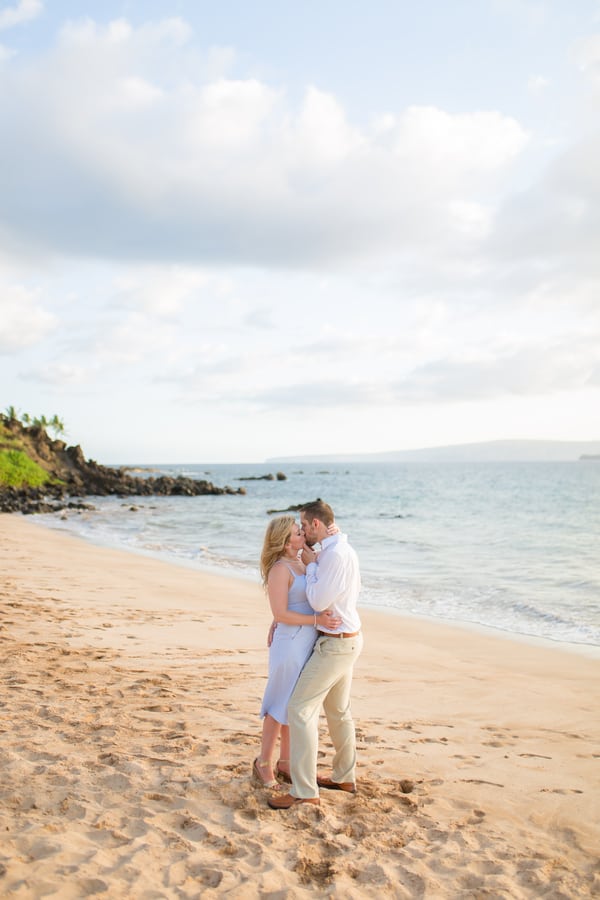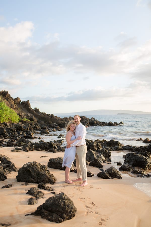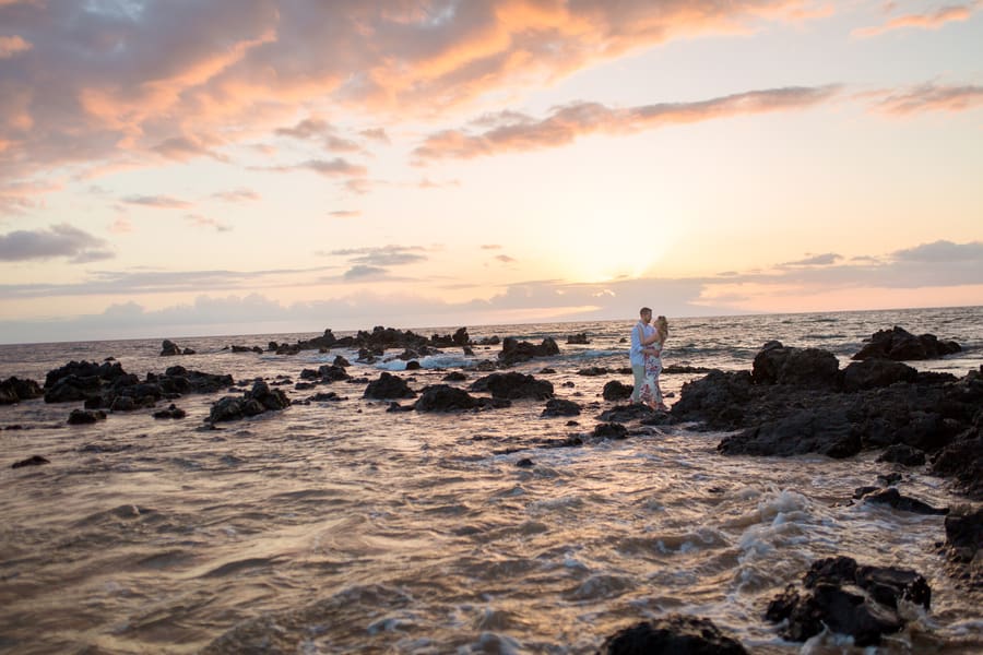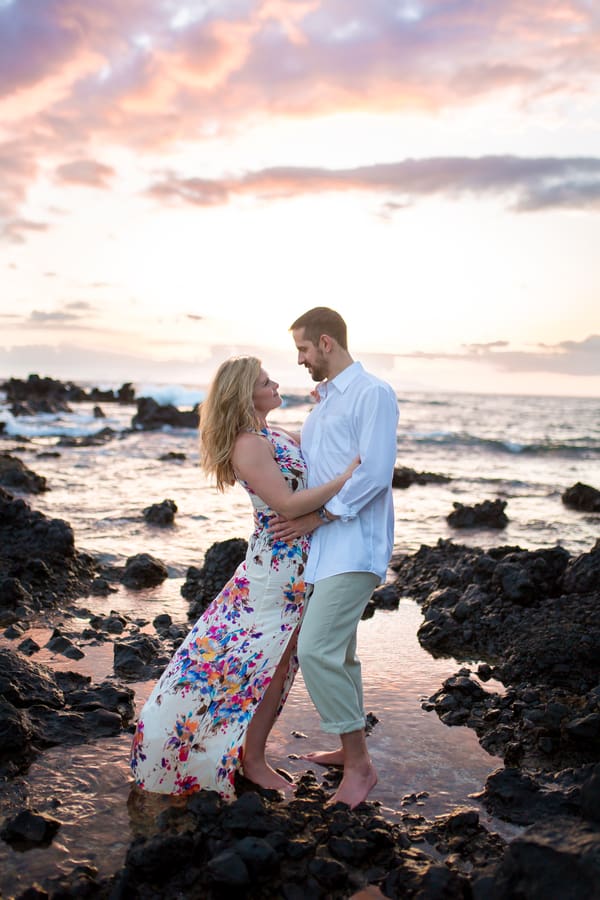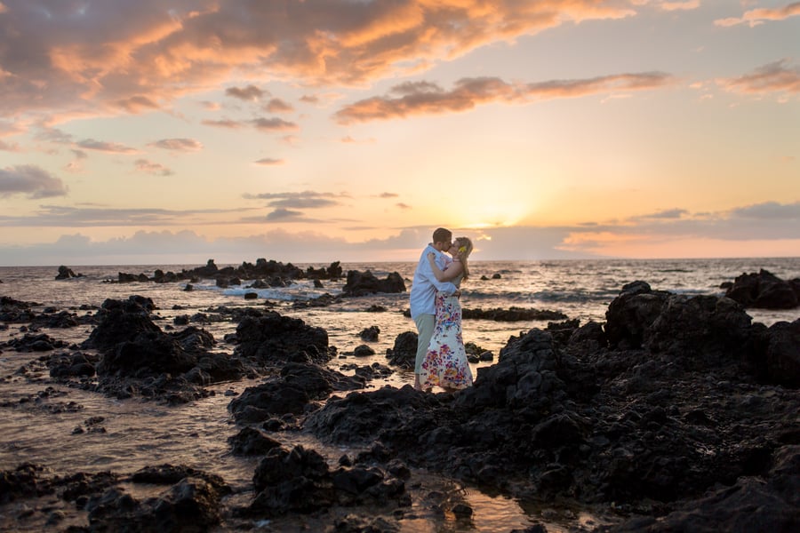 Kelli and Adam flew in for a work conference from Washington, and as they are planning a Maui wedding for late next year, decided that they would scope out some locations and get their engagement photos done while they are here. Blending a family is hard and that’s what these two hard working parents are doing! It was a nice getaway as between them they have 8 children! We arrived at Palauea Beach and I knew that Kelli was having a rough day with venue shopping! I told her not to worry and that her engagement session was going to be awesome! When they arrived, I had champagne glasses and champagne ready for them! Before you know it, the stress of that day was gone, and Kelli’s beautiful smile had returned! I seriously could have photographed them all day! Kelli and Adam didn’t need much guidance from me, as their love really took over! I felt like I was jut capturing them in their element! We had the most beautiful sunset Maui could have provided us, with black lava rocks to sit on! For the final photos, I had Adam come to me. I told him for this last shot, I wanted him to whisper in her ear why he chose her. Why he wants to spend the rest of his life with her.